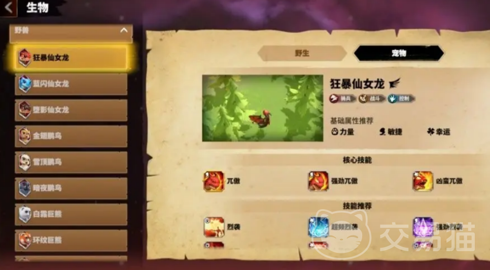 每个英雄都可以携带一只宠物,不过需要注意只有主将可以带。每个宠物有被动技能,部分还有可以主动释放的怒气技,能为玩家的战斗提供助力。目前游戏离实装了一共13种宠物,3种仙女龙、3种鹏鸟、3种巨熊、4种蜥蜴,不同的宠物适合不同的英雄兵种携带。