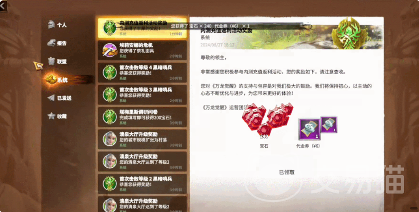 现在朋友们知道万龙觉醒星火龙吟在哪了吧,这并不是一开始就能拿到的一种资源道具,而是达成指定条件之后才能领取的,这些道具都是可以帮助大家在初期建立优势的,所以准备参与公测的小伙伴们,可千万不要错过这种福利了。