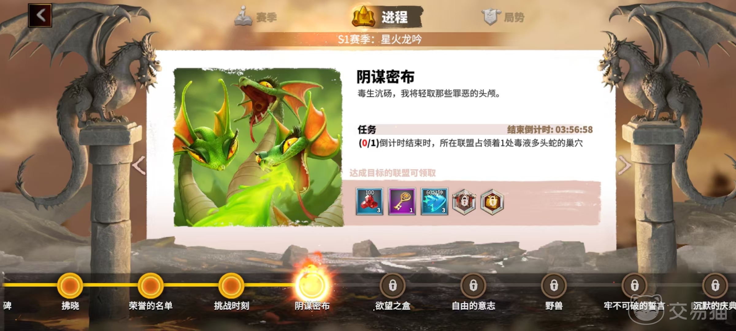 赛季奖励中更是包含大家在当前赛季所能结算的所有奖励,赛季进行到一段时间后就会进行结算,这样能够提前查看到。在第2个进程选项中,能够展现出当前服务器在当前赛季的进程情况,进程分为多个不同的节点,大家只要完成相应的节点,就可以在这里领取奖励,包括训练加速时间、各种宝物钥匙以及宝石等。也是大家在赛季中需要快速达成的条件,这些在这里都能够直接查看到。