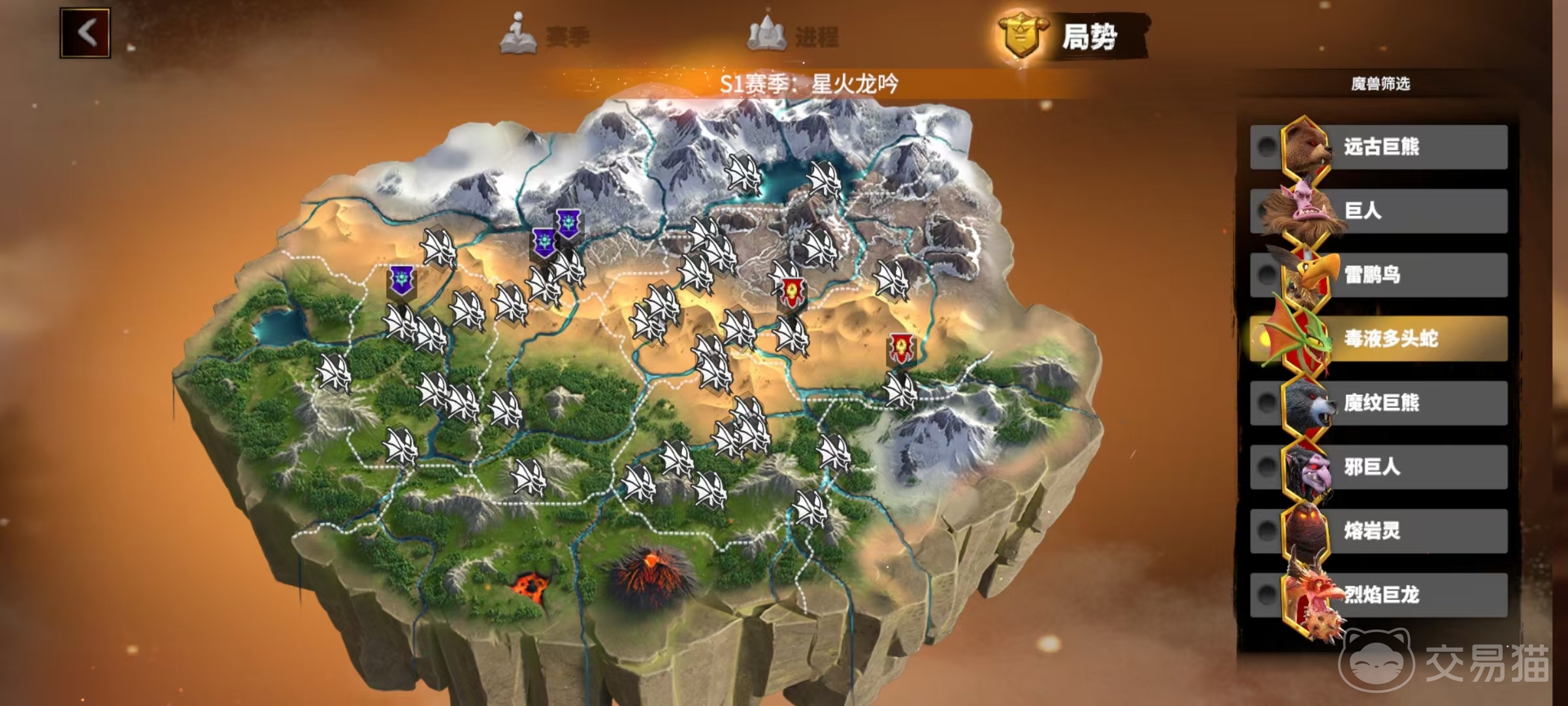 第3个局势,可以直接查看地图中魔兽的分布情况,包括远古巨人,远古巨熊,雷鹏鸟等在这里都可以直接筛选查看到,帮助玩家确定要发展的方向。玩家占领这些魔兽之后,可以获得相应的占领收益,在这里也可以查看到占领情况。