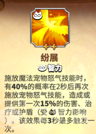 纷展:第1次施法之后,宠物有40%的概率,在两秒之后再次释放怒气技能,造成或者提供第1次伤害的15%伤害、治疗量或者护盾值。效果受到宠物的智力值影响,最多三秒之内触发一次。