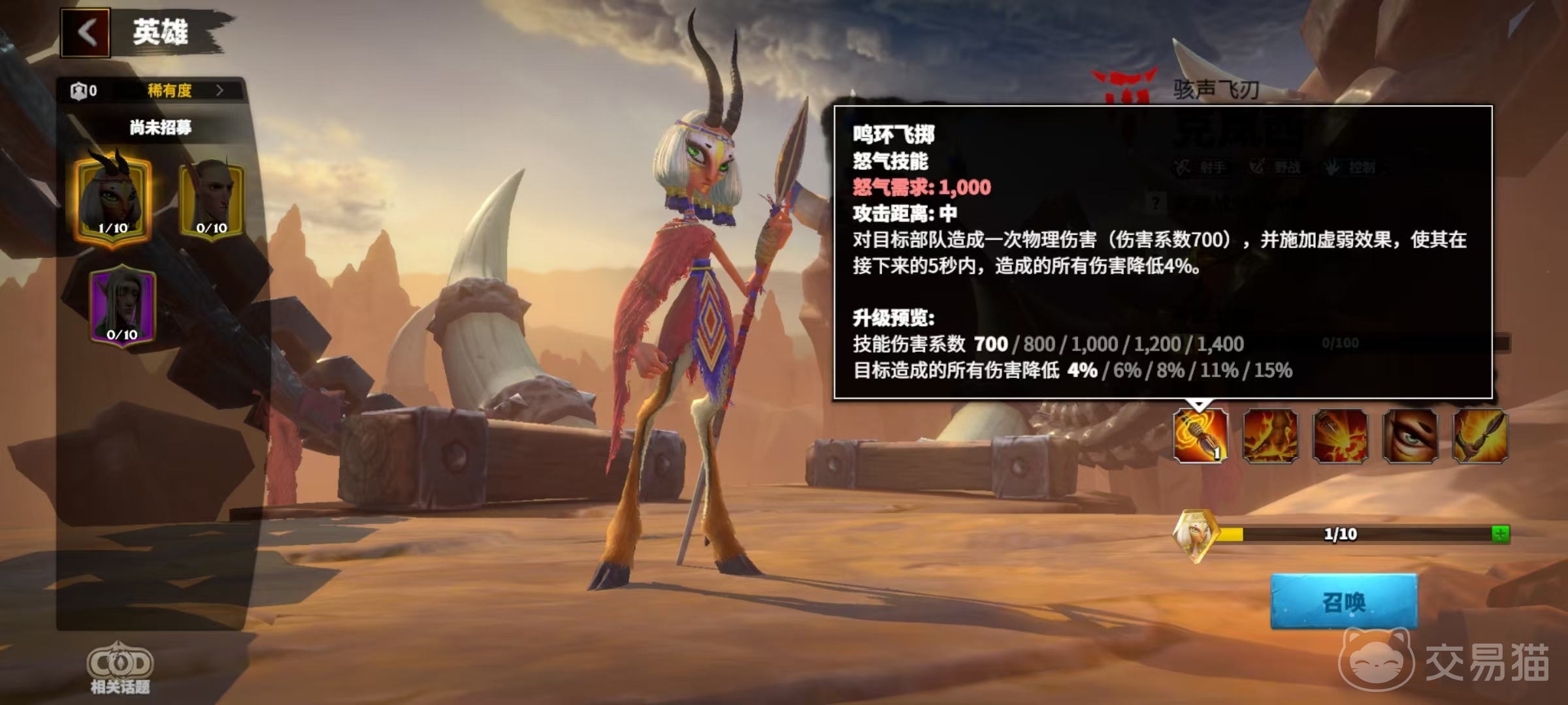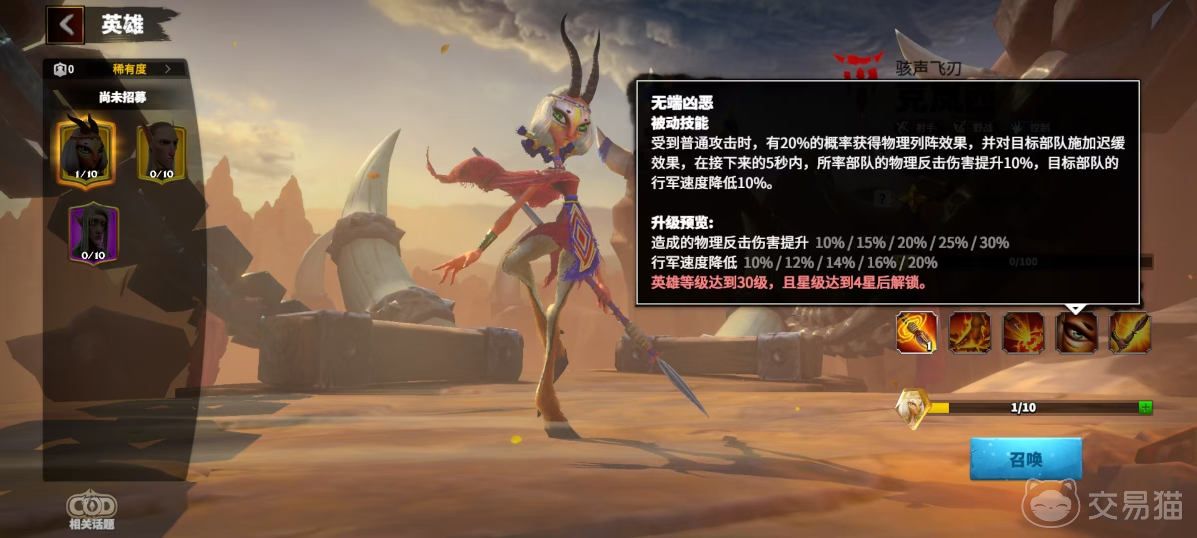 该技能伤害突出,造成的效果也非常实用,所以是大家在战斗过程中很适合的选择。此外还具有一些被动技能,例如挑衅,在野外时所率领的部队,造成普通伤害提高,受到的英雄技能伤害降低。狩猎律动,使所率领的射手单位物理攻击力提升。无端凶恶,受到普攻时有几率获得列阵效果,对目标部队施加迟缓,所在部队的物理反击伤害提升目标,部队的行军速度降低等。