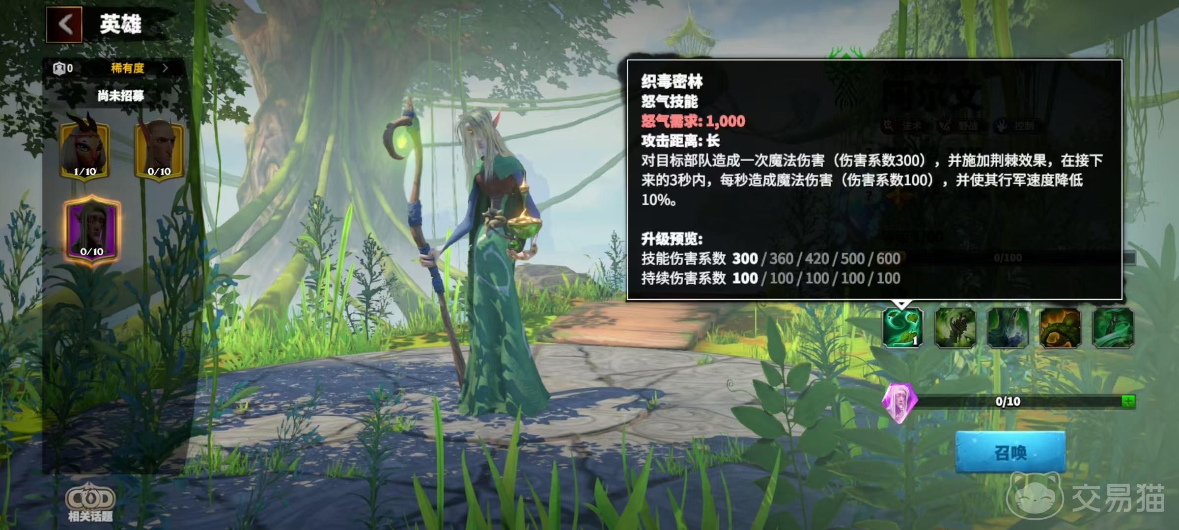 最后一个阿尔文号称是冷言毒师,他也是法师英雄,怒气技能可以使目标部队受到魔法伤害,并施加荆棘效果,持续造成魔法伤害,并降低行军速度。另外还有被动技能毒藤伴生,在受到普通攻击时有几率对伤害来源部队施加荆棘效果,降低移动速度和持续魔法伤害。被动瘴雾之森属于增强主动技能,能够提高伤害系数和各种限制效果。
