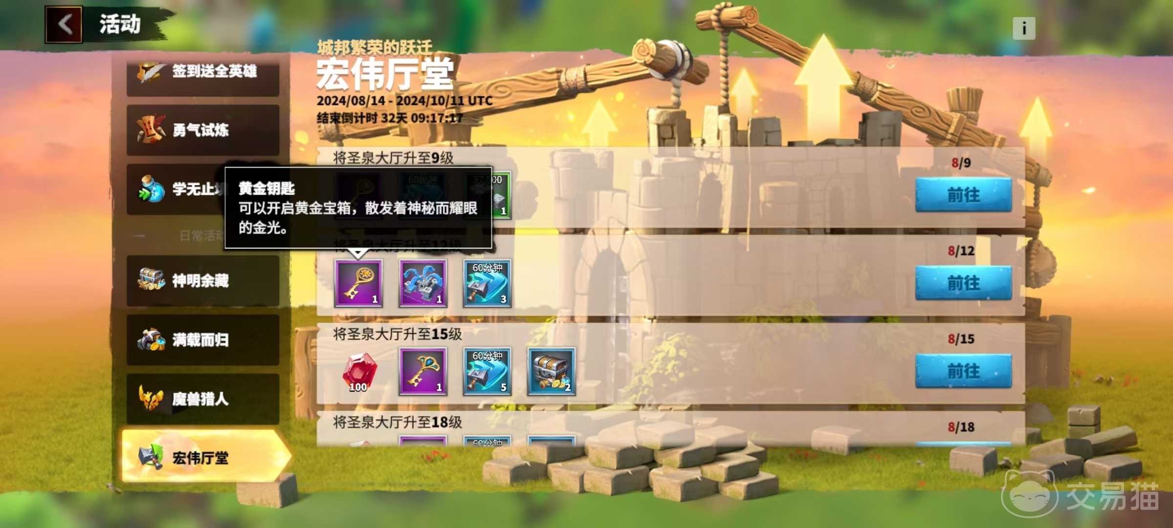 另外一项是各种活动,目前主要开放的活动包括宏伟厅堂、魔兽猎人、满载而归、神明余藏等,这些活动都有机会获得。例如在勇气试炼中,就能够得到黄金钥匙,白银钥匙,传说勋章等。在学无止境中,通过完成相应的任务,能够获得黄金钥匙,史诗幸运勋章和各种资源。在宏伟厅堂中,完成相应的任务可获得黄金钥匙,建筑加速时间和各种资源等。这些任务也无需大家专门去做,只要正常发展自身的势力都可以完成。