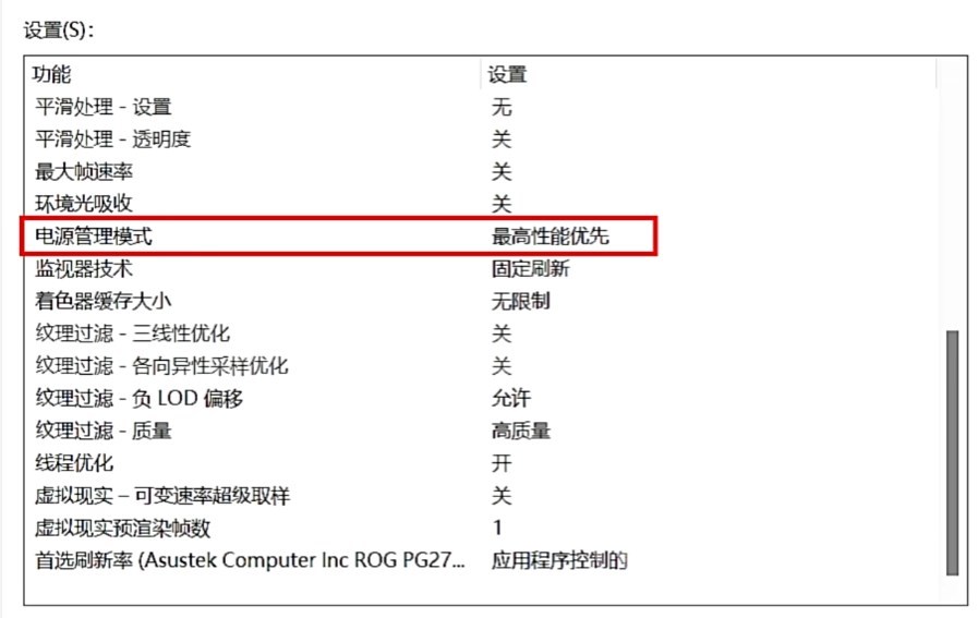 其他的多项也都设置成关闭,然后是电源管理模式选择以“最高性能优先”,监视器技术选择“固定刷新”,着色器缓存大小设置成无限制,纹理过滤质量选择高质量,这个如果设置得太低的话,画面会出现许多马赛克。