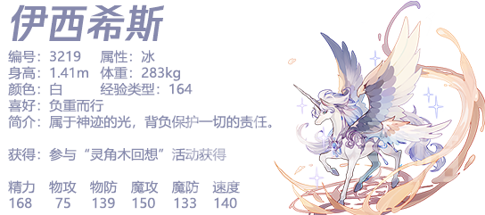 伊西希斯作为一只优雅又强大的宠物,可以召唤光辉为自己战斗!他就好像踩踏着五彩祥云的骏马一般,晃悠悠的来到人间作战。若是能将他其招纳为坐骑,便可成为神圣骑士。不过玩家更偏爱使用它进行作战,从而发挥强大的冰属性输出能力!