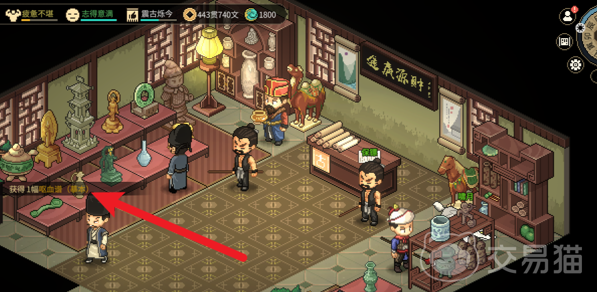 当好感度达标以后,点击一下左侧的木架子,呕血谱就放在木架子上面,点击一下获取便可以立即得到呕血谱的摹本了,这里大家需要注意的是千万不要没有刷好感度就私自去获得呕血谱的摹本,这种行为会被老板视为盗窃。