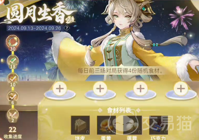 除了皮肤外,游戏官方还为我们准备了其他的活动,首先介绍的便是圆月生香,这个活动是每日前三场战斗均可以获取4种随机食材,并可以使用获取到的食材来完成月饼的订单,完成之后可以获取到丰厚的奖励。