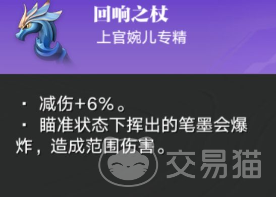 ”回响之杖”就是第二个推荐的专精了,佩戴之后,可以拥有让减伤效果提高6%,在婉儿进入瞄准状态之后,挥出笔墨时,会在路径终点发生爆炸,对敌人造成范围性的伤害,可以用来攻击远距离比较密集的敌人,配上上述的专精还能与敌人形成良好的拉扯。