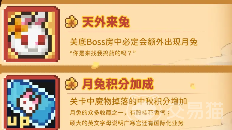 本次的活动将会新增加两个因子,首先第一个因子叫做天外来兔,在游戏关底BOSS的房间里必定会出现额外的月兔。第二个因子则是月兔积分加成,玩家们在关卡之中魔物掉落的中秋积分将会增加。