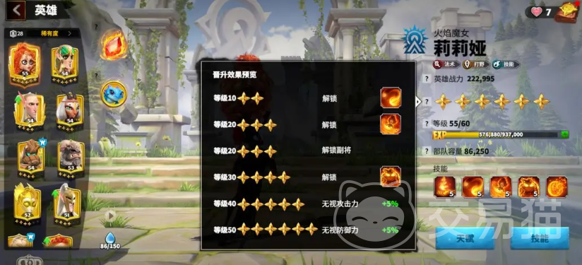 在英雄升到一定的等级后,就可以使用勋章来升星,升星可以解锁新的技能。而给英雄技能升级则要用到信物,升级的是是从已经解锁的技能里随机选1个升级,而非指定技能升级,说到这里可能大家就明白了。