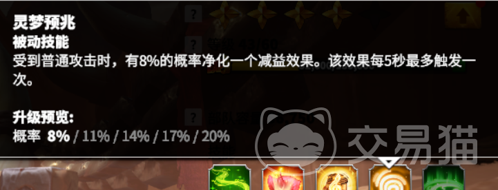 灵梦预兆:受到普通攻击的时候,有8%的概率净化一个debuff,效果每5秒最多触发一次。升级可以获取最高20%净化概率。