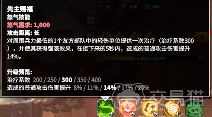 厄尔的主动技能是先主赐福:属于怒气技能,我需要1000点怒气释放。效果是对附近兵力最低的友方部队中,轻伤单位提供一次治疗,并且使其获取强袭效果,5秒之内造成的普攻伤害提升。升级可以使治疗系数与普攻伤害提升倍率增加,最高等级治疗系数为400,最高普攻增伤为20%。