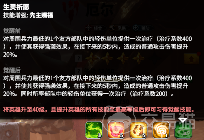 提升厄尔40级之后,并且将所有的技能提升到最高级就能学习觉醒技能:生灵祈愿。觉醒的效果是,对于兵力最低的友方部队中,一个轻伤单位提供一次治疗,获得强袭效果后5秒提升普攻伤害,并且使部队中有轻伤的单位获取一次治疗,也就是增加普攻伤害与两次治疗。