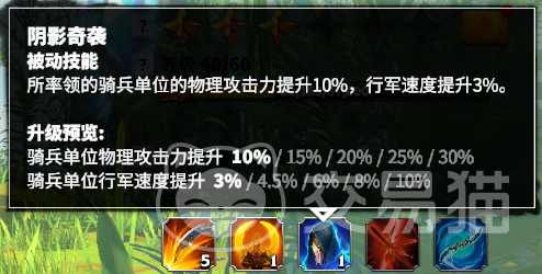 其中的被动技能可以让他所率领的骑兵单位物理攻击提升10%,行军速度提升3%。这样就能让你的队伍更灵活攻打其他人,天赋方面以野战系为主,可以提升攻击力,并大幅增强输出能力。