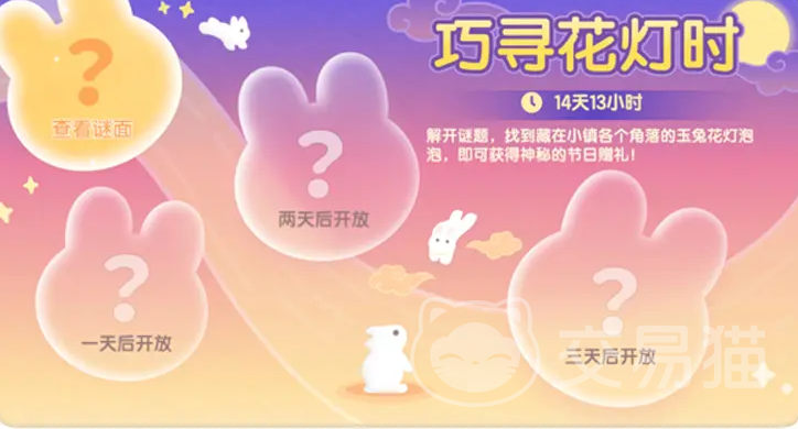 首先第一个活动是巧寻花灯时,这个活动主要以猜字谜为主,玩家们需要根据提示来解开开灯花上的谜题,在解开谜题之后便可以得到泡泡的信息。泡泡基本上都是被散布在城镇的角落之中,玩家们找到泡泡之后便可以获取到中秋的限定家具,这些家具只在本次活动中出现,玩家们千万不要错过。