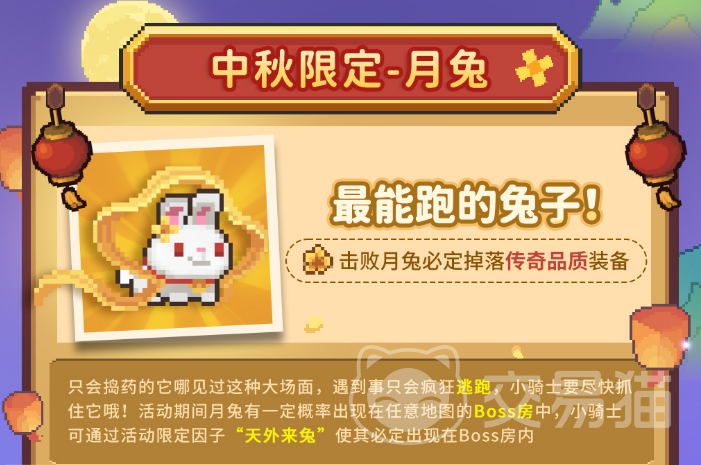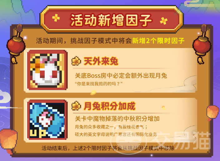 为了让中秋活动更加丰富多样,游戏还加入了两个全新的因子,进一步提升了活动的趣味性与奖励力度。第一个因子名为“天外来兔”,它的效果是在每个关卡的BOSS房间内必定会出现额外的月兔。这意味着大家能在普通的关卡中遇到月兔,还可在面对强大的BOSS时,获得更多与月兔交战的机会。额外的月兔就表示着更多的传奇装备掉落,这也给玩家带来了更大的收益。