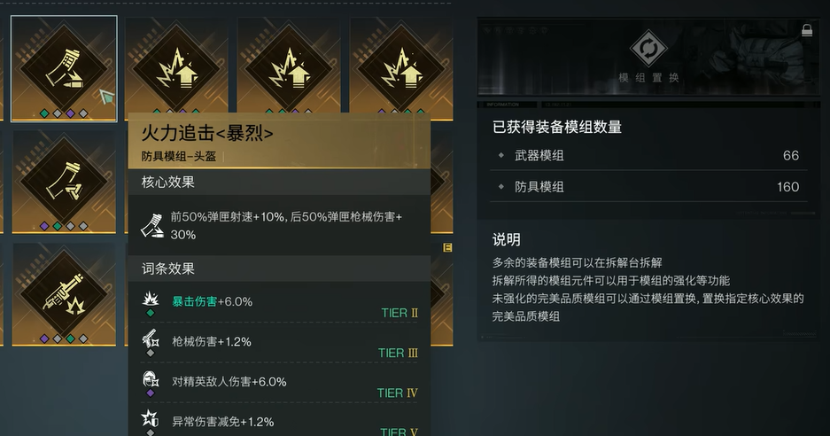 而在具体的配件选择上,裤子推荐“暴击狂热”模组,这个模组能够大幅提高暴击几率,帮助你在高射速的情况下打出更多的爆发伤害。配合上手套的“暴击强化”模组,暴击伤害将进一步提升,让你每一发子弹都具有致命的威力。