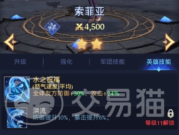 她的技能主要有两个,第一个为水之祝福,只要解锁该英雄就可以去使用,效果为全体友方防御增加30%、同时攻击也会增加24%,这个效果还是非常不错的,此外还有洪流,在等级达到11的时候就能解锁,能让己方这边的防御提升10%,暴击也可提升6%。