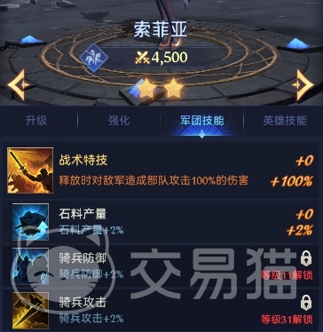 在军团技能方面,其中战术特技可直接对敌军造成攻击100%的伤害,其次就是石料产量方面也可增加2%,当然了在等级达到11级以后,玩家的骑兵防御可增加2%,同时等级达到31以后,己方这边的骑兵攻击也会增加2%。