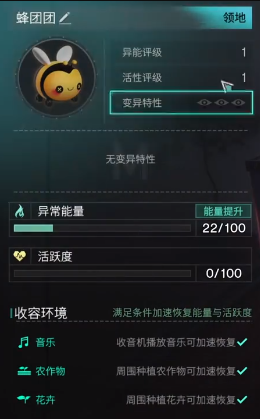 蜂团团的生效方式是异常能量大于30,只要大于30才会自动激活并进入工作状态中,大家可以布置好它想要的环境来提高异常能力,蜂团团需要音乐、农作物、花卉这三样东西。