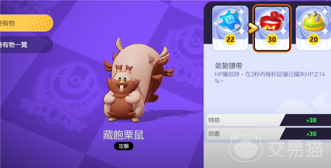 首先藏饱栗鼠的技能非常适合用作防御宝可梦,它的回血技能能够提高自己的续航能力,持有物方面,小编会推荐相关的持有物,分别是“救援屏障”、“气势头带”、“凸凸头盔”或者“突击背心”,以上四种任选三个持有物带上战场即可,如果你想要提高藏饱栗鼠的回复能力可以主选“救援屏障”、“气势头带”,这两个持有物均可提升宝可梦的血量回复能力,而提高防御能力则可以选择后面的两个也就是头盔和背心,头盔可以加防御背心则是可以加护盾。