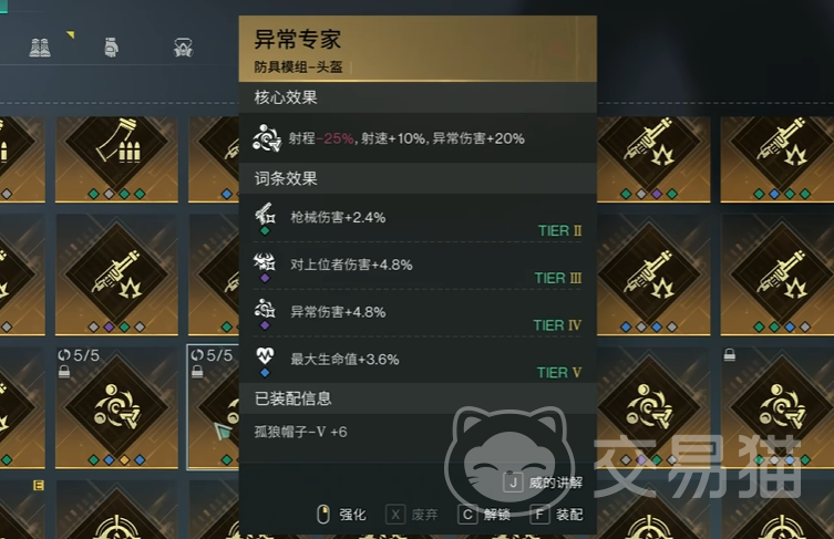 在头部模组这方面通常来说有两个选择,幸运牌手和异常专家。小编比较推荐玩家们选择异常专家,虽然说在射程方面有所削弱,但是射速和异常伤害分别提升了10%与20%,总体来说性价比还是相当高的。如果再搭配射速图纸来使用的话,那么射速将会获得相当大幅度的提升。