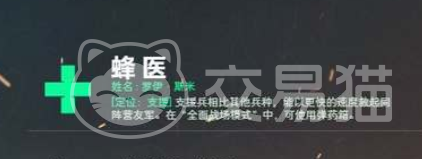 蜂医的定位是支援兵种,是阵营搭配中不可或缺的一个兵种,玩家一般在全面战场模式中使用该角色比较频繁。蜂医的最经典的战术装备就是激素枪,显而易见,该枪支最大的特点是进行治疗。不同于其他单一的治疗工具,玩家按下开关就可以同时治疗多个队友,同时还会抑制队友的异常状态从而保证治疗过程顺利。在必要时候,玩家还可以长按此操作达成对自己进行治疗的目的。