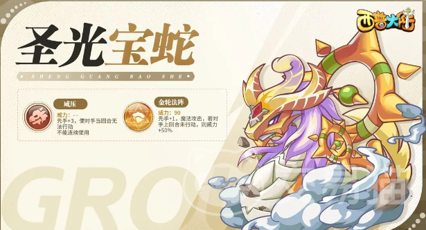 圣光宝蛇还能施展出神圣的魔法攻击,在光芒上闪耀间,就会有强大的力量发射出去,让一切都显得那么游刃有余,它的技能有威压,这个招式可以让对手在当前回合内无法行动,这个技能虽然强力但是不能连续使用。
