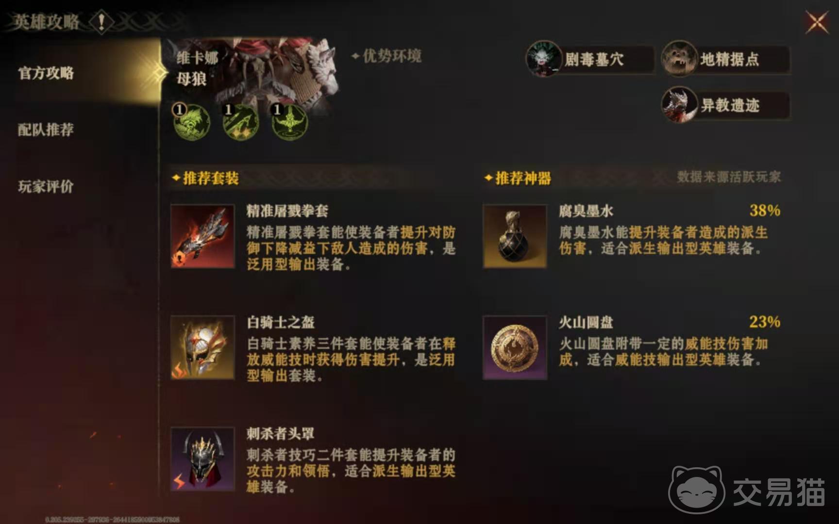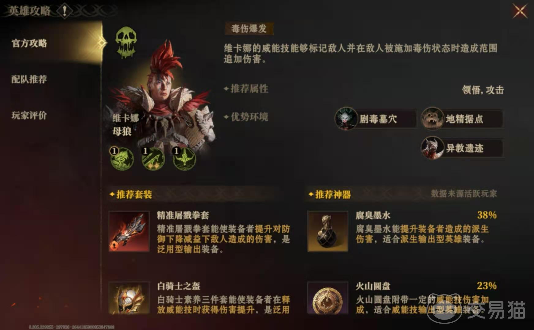 除了自身实力要强之外,好的队友也可以促进维卡娜自己的发挥,刚开始玩的时候,怎么搭配其实影响都不大,因为前期遇到的敌人实力都很一般,但随着游戏的深入,你就要考虑阵容中的其他英雄了,如果你不知道该挑谁,那么可以试试下面这个搭配,核心输出就用维卡娜,副输出就用柯林或者洛拉里,坦克最好用厄尔丹其他毒系英雄也行,辅助选一个与维卡娜配合好的就行。