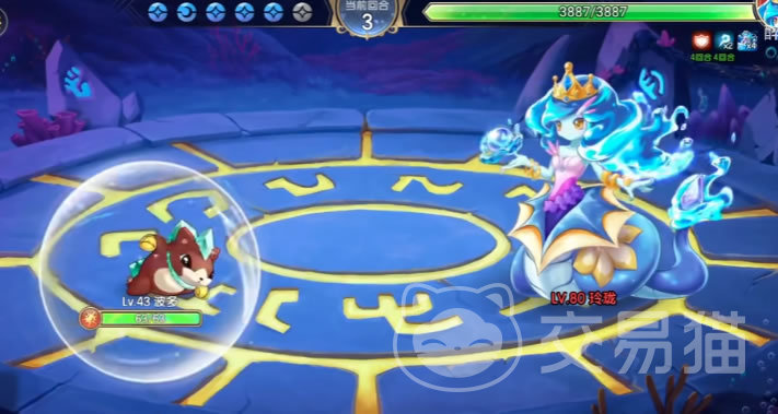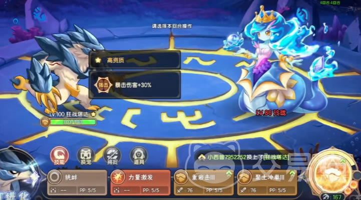 这里由于玲珑是物防属性较低的怪,所以用的是波多。小地鼠波多虽然没有什么攻击力,但它的技能噪音可以有效的破防,而且特有的技能守住可以撑住一个回合不会被杀,从而可以安全地放出噪音技能。