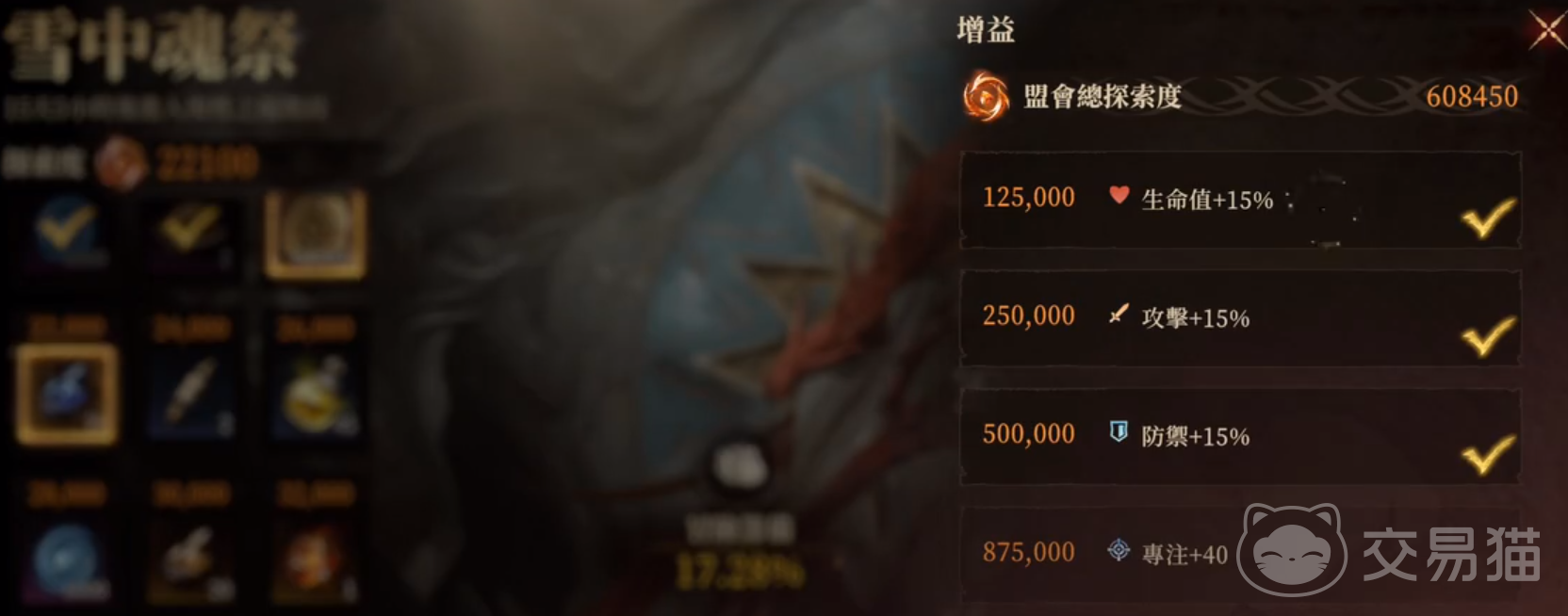 盟会探索对于活动的加成非常高,一个活跃度高的联盟,成员可以快速累积通关元素领域任务,每次有超过2000以上的探索度奖励。参加累积1500次,就有一次性3000点的奖励。同时在打探索活动关卡,联盟总探索度会实现增益,比如50万的探索度可以增加15%的关卡增益。