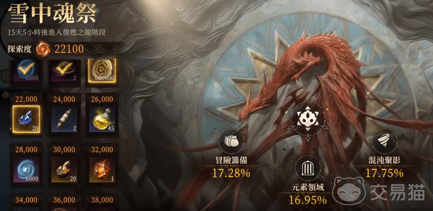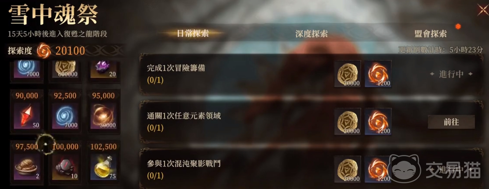 雪中魂祭分为日常探索、深度探索以及盟会探索,这三个部分的任务可以增加千点探索度,尤其是日常探索三个任务:完成一次冒险筹备、通关一次任意元素领域、一次混沌巨影战斗,都是可以快速做完的每日任务。