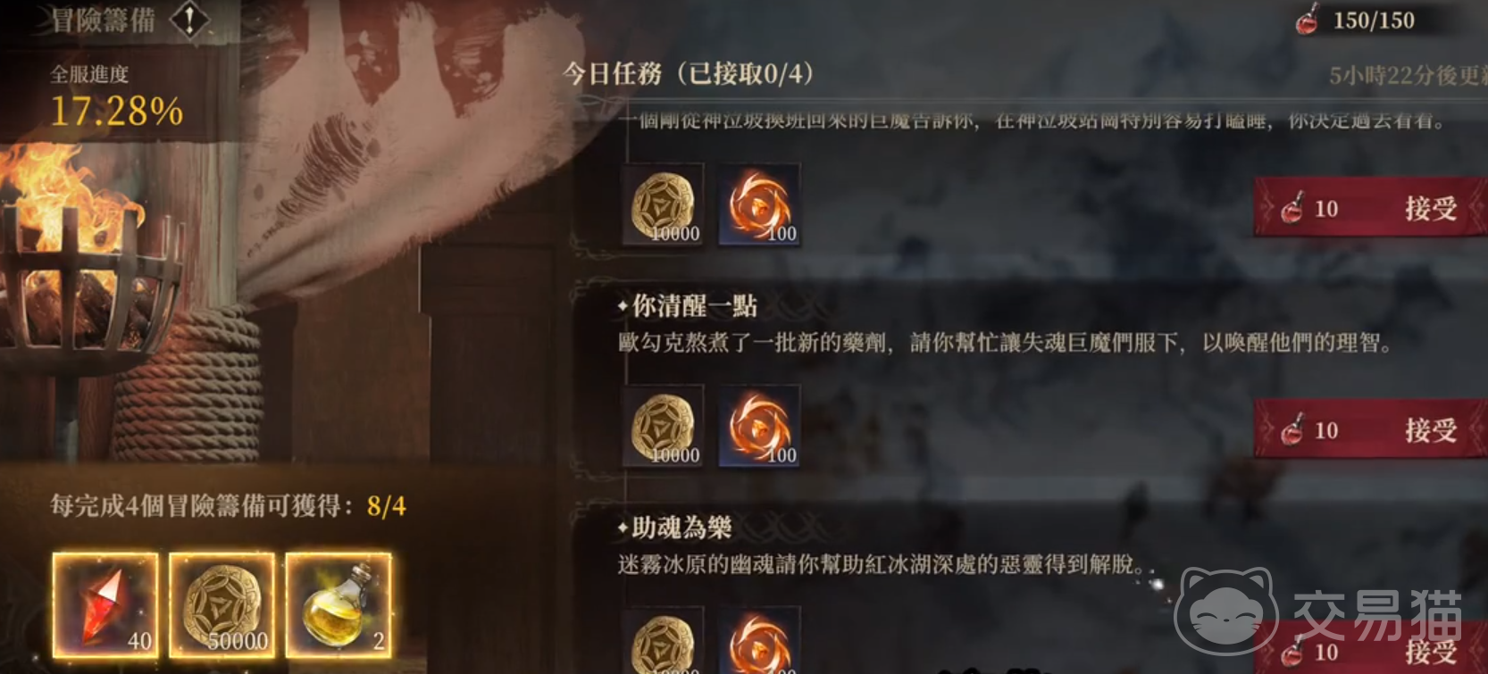 冒险筹备每天可以解锁4个任务,都是比较好完成的日常小任务,比如给巨魔解冻生肉、帮巨魔跑腿以及制作药剂等。接取冒险筹备的任务,需要消耗龙牙汤剂,这个道具是每日都会恢复150点,推荐各位玩家一次性把所有的任务接完,因为龙牙汤剂溢出是没有收益的。