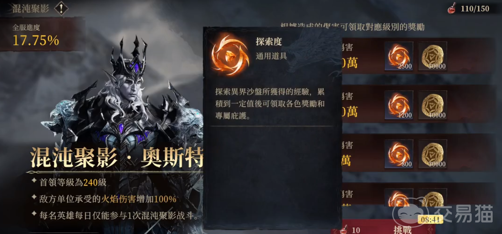 混沌聚影的是游荡者首领是240级,挑战同样一次消耗10个龙牙汤剂。boss的特效是受到火属性的伤害会翻倍,推荐玩家使用火毒队或者火光队进行挑战,加提前吃火属性加成料理会相对简单,每日每位英雄仅有一次参与战斗的机会,打完6个首领就能收获4800探索点,各位玩家不要错过。
