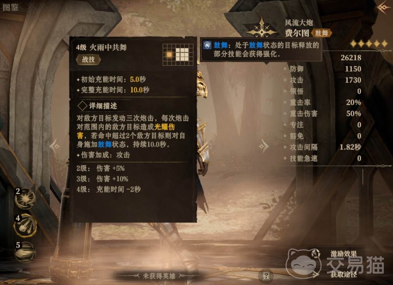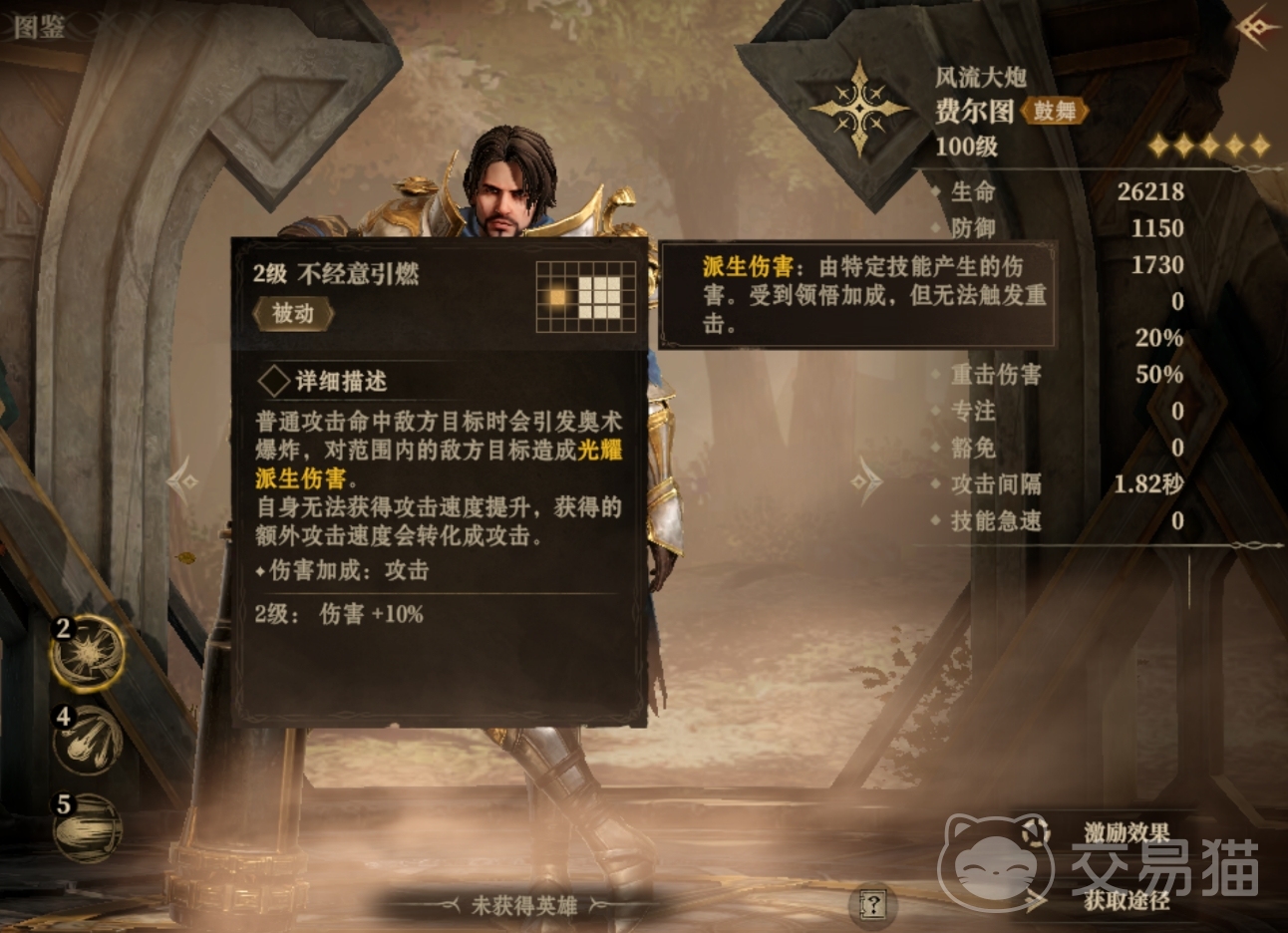 费尔图的被动可让其普攻变为范围伤害,虽然该伤害属于派生伤害无法触发重击,但在实战中的总伤害量并不低,更何况费尔图还有额外攻速转化为攻击的恶性。当费尔图施放战技时,只要目标范围内的敌人数量多于两名,就能为自身施加鼓舞,在PVE推图时很好用,不适合用来打boss。