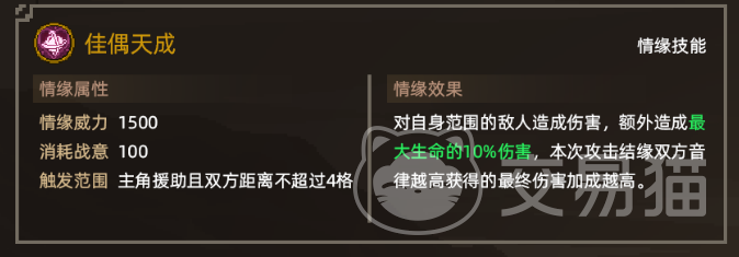 在好感度达到要求后,持有焦尾琴的你可以在妙音坊门口等待顾倾城出现。她会询问你是否带来了焦尾琴,经过对话后,你就有机会邀请她加入队伍。入队后,你只需带她前往月老祠,消耗一个三生石,然后i就可以和顾倾城进行结缘了,还能够得到情缘技能【佳偶天成】。
