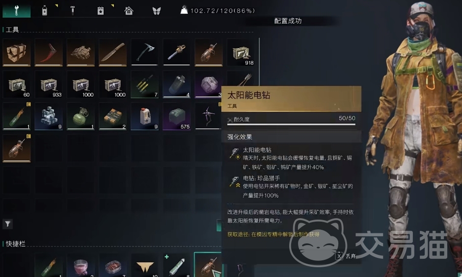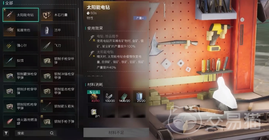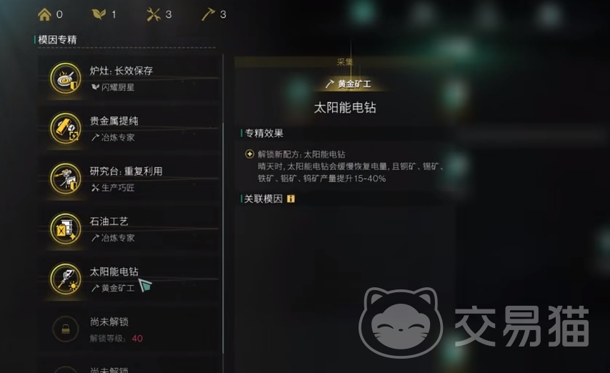 当玩家们来到35级后,就可在模因专精里解锁太阳能电钻了,此后就能在制作台里把太阳能电钻给造出来。制造该道具所需材料除了金矿外,其它都可通过采集或分解来获取,而且获取的难度并不大,若是玩家缺少材料可前往对应的地图来进行收集。要是缺金矿则可前往黑心地带采集,或是与别人进行交换。
