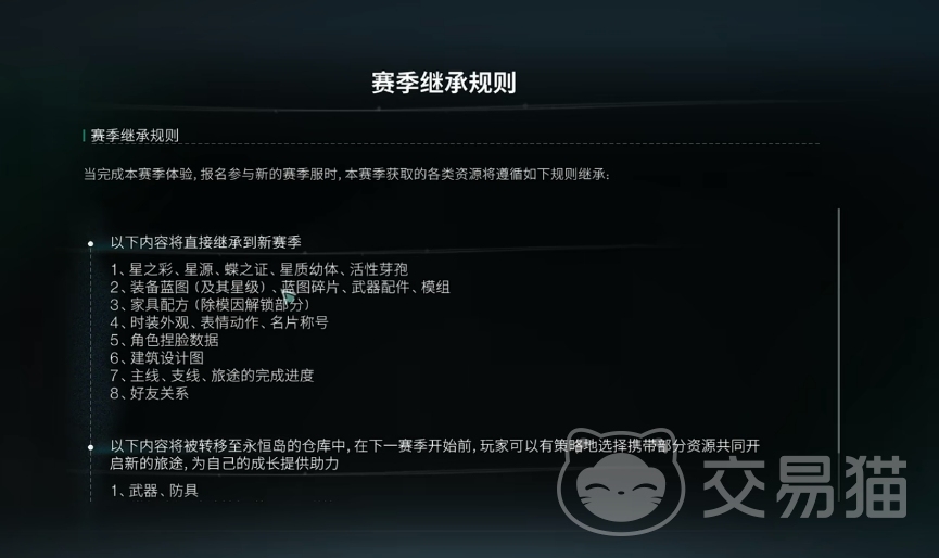 通过七日世界赛季继承规则,稀有道具和材料星之彩、星源、蓝图和蓝图碎片等都会随玩家们一起前往新赛季,这也意味着玩家们可直接继承上赛季的蓝图升星进度等较为重要的功能玩法。同时,一些外观类和建筑相关的东西也将会被带到新赛季,例如各家具的配方、时装、动作和捏脸的数据等。