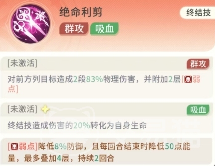 同时绝命利剪还会附加2层弱点效果,降低敌人的防御力并每回合结束时降低其50点能量,此外绝命利剪的吸血效果也是其亮点之一,能够将终结技造成伤害的20%转化为自身生命值,艾丽诺的天赋技能随着星级的提升逐渐解锁,为她提供了更多的生存能力和输出能力,一星时,艾丽诺解锁了精华吸取技能。