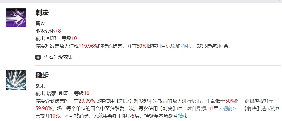 传影的战术技能是当他受到伤害时,有29.99%的概率触发刺决的状态,对攻击者进行反击,即使在最不利的情况下,传影也能寻找到反击的机会,而当生命值低于50%时,这一概率更是提升至惊人的59.98%,几乎意味着每次受伤都有可能转化为反击的机会,而且每当刺决被使用时,传影会获得一层砺剑效的果,每层效果都能让刺决的伤害提升10%,并且这一效果可以叠加至多5层,持续到战斗结束。
