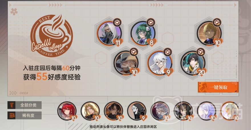 庄园的休息区是一个重要的功能区,最多可放置6名伙伴入驻庄园,入驻的伙伴可以在庄园内自由活动,随时间累积好感度,领取后可提升对应伙伴的好感度。需要注意的是,当伙伴好感等级达到突破瓶颈时,入驻将无法继续累积好感度,庄园交互玩法中,拜访和互助是两个重要的环节,每日玩家都可以前往好友庄园拜访好友庄园入驻的伙伴,通过拜访可以获得对应被拜访伙伴的碎片。