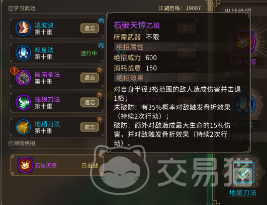 石破天惊不仅仅是名字震撼,它的实际战斗效果同样非凡。作为一门甲级绝招,它在游戏中的表现绝对不容小觑。只需悟性1点,你便能掌握这门可以改变战斗局势的强大技能。对于那些初入江湖的侠客们来说,石破天惊不仅能显著提升你的战斗力,还能助你快速打败强敌,成为江湖中的一代大侠。