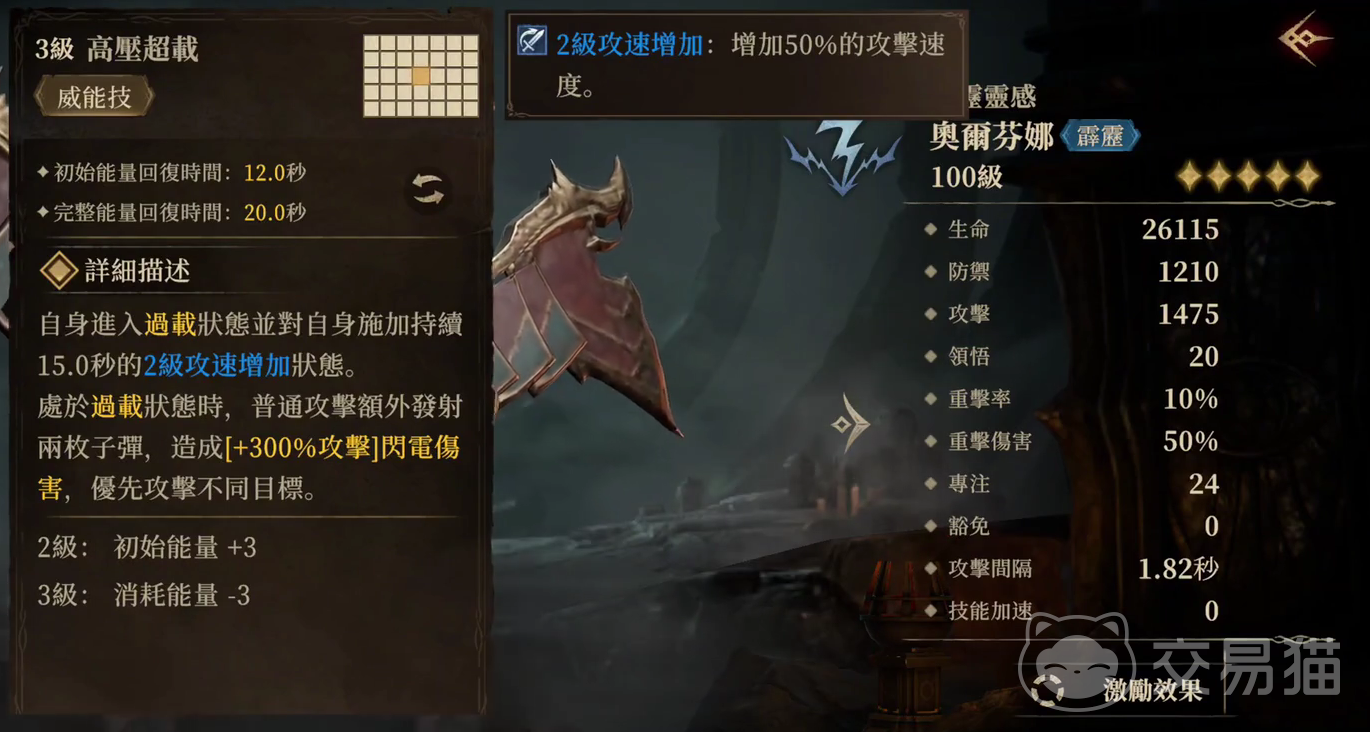 奥尔芬娜在游戏中的定位是输出类角色,它能够让自身进入过载的状态,并且增加基础的攻击速度,在过载状态之下,二分那可以对敌人发射两颗子弹,分别造成基础攻击倍率为30%的雷电属性伤害,以及基础攻击倍率为15%的衍射伤害。