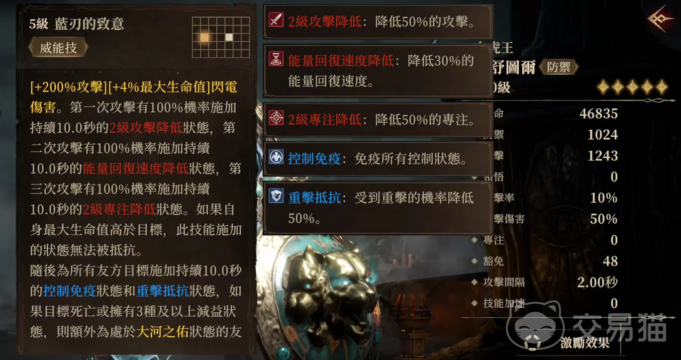 白虎王释放大招时,可以对友方单位施加一个回合的控制免疫状态,并且在这个回合之内,敌人的任何重击都将遭到抵抗,白虎王的大招可以对敌人造成基础攻击倍率为200%的范围攻击,但是该攻击会随着攻击的次数而逐渐衰减,最低的攻击倍率为50%。