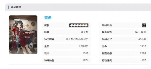 音希:铃袭属于普通攻击,在选定敌人之后可以造成两次61.01%的物理性伤害。飞铃化锥属于战术技能在选定敌人之后所造成的物理性伤害可以达到126.97%,而且还可以加强自身10%的暴击率,在三个回合内都有效果。群鸟合奏属于超限技能,可以给敌人造成不同等级的物理性伤害,每一次暴击就可以有效增加15%的暴击伤害,同时还可以获得额外消耗能及伤害。