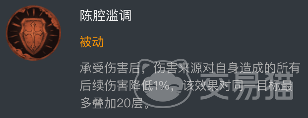 雅米拉的四技能被动陈腔滥调可以让雅米拉再承受伤害后,让这个伤害的来源对自身造成所有的后续伤害都降低百分之一,这个效果对同一个目标敌人可以最多叠加二十层。