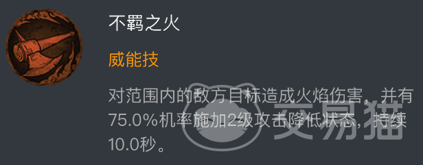 雅米拉的二技能威能技不羁之火可以对技能范围内的敌军造成火焰伤害,并且有大概率可以施加两级的攻击降低效果,并持续十秒。