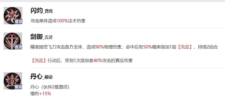 很多人对苏茜的技能并不了解,其实她是一位实力强大的战士,她的技能能够对敌方单体造成伤害,同时有概率给目标添加流血的状态,苏茜的普攻技能是攻击单体造成100%法术伤害,而她的言灵技能剑御则更加强大。精准操控飞刀攻击敌方全体,造成90%物理伤害,命中后有50%概率添加1层血持续2回合流血行动后,受到1次添加者40%攻击的真实伤害,这个技能不仅能够对多个敌人造成伤害,还有可能触发流血效果,让敌人在接下来的战斗中持续受到伤害。