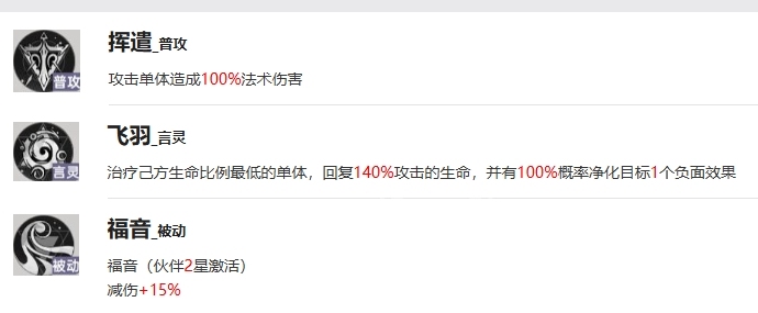当伙伴达到2星时,可以激活福音技能,为自己提供15%的减伤效果,当伙伴达到3星时,可以激活植育技能,在普攻后额外治疗我方生命比例最低的单体目标,回复相当于自身15%攻击的生命值,当伙伴达到4星时,可以激活属灵技能,为全队提供10%的全属性加成,而当伙伴达到5星时,则可以激活涓滴技能,使得己方其他友方单位释放言灵后自身有50%的概率回复1点灵值。